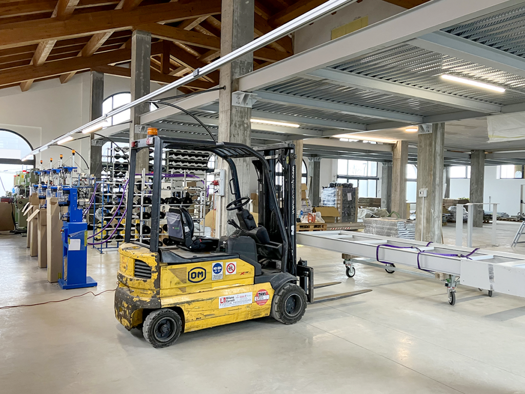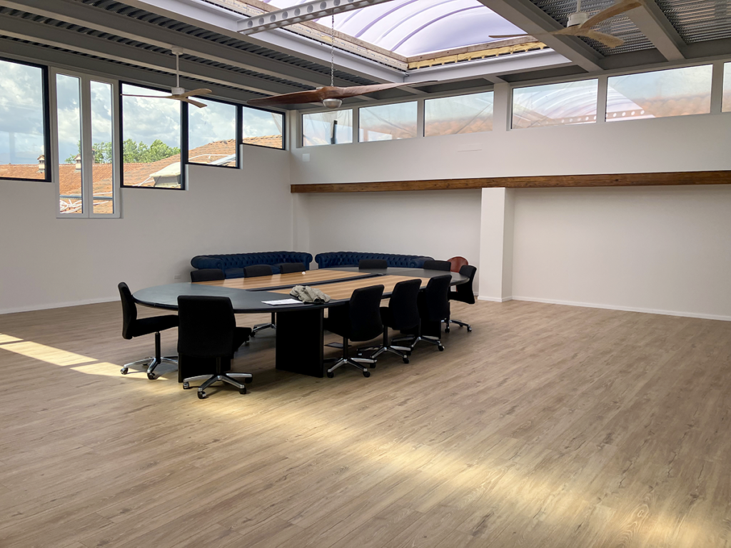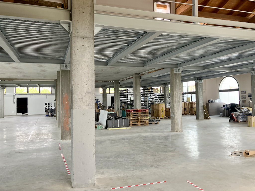 il soppalco è aperto e costruito nella zona centrale del salone con superficie di mq 200. La torre ha una superficie di mq. 100, sorge al centro del soppalco ed è chiusa sui 4 lati completamente vetrati, ha due ingressi, un lucernario a soffitto da mq 20 ed è dotata di aria condizionata.
